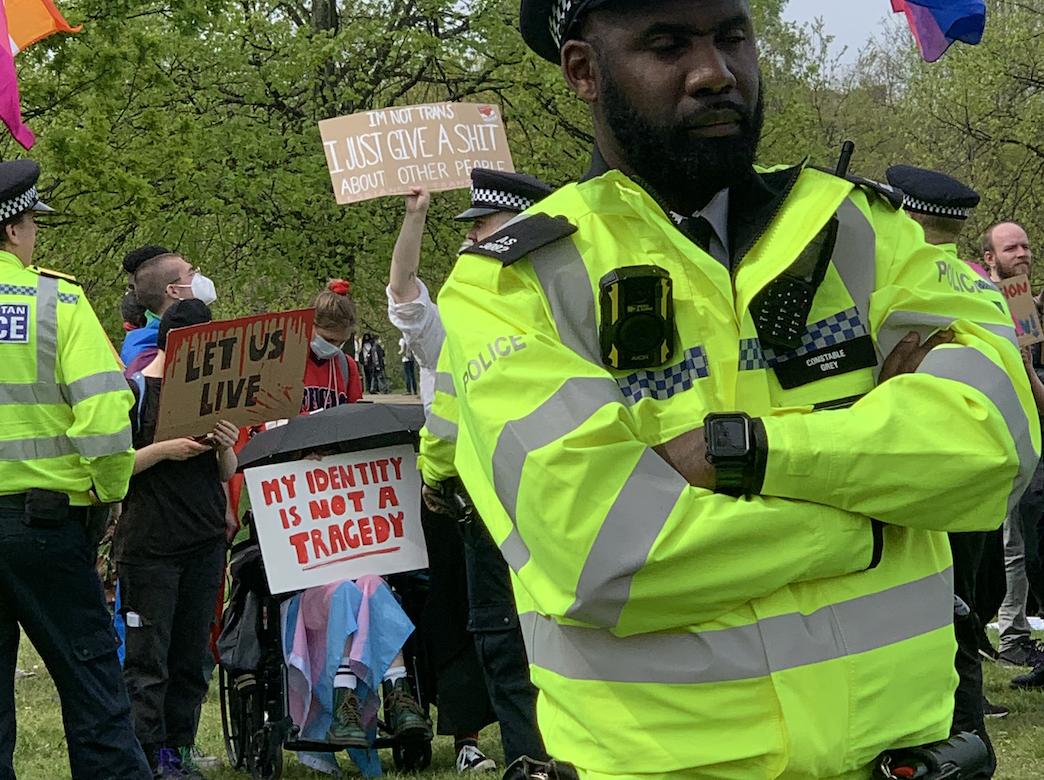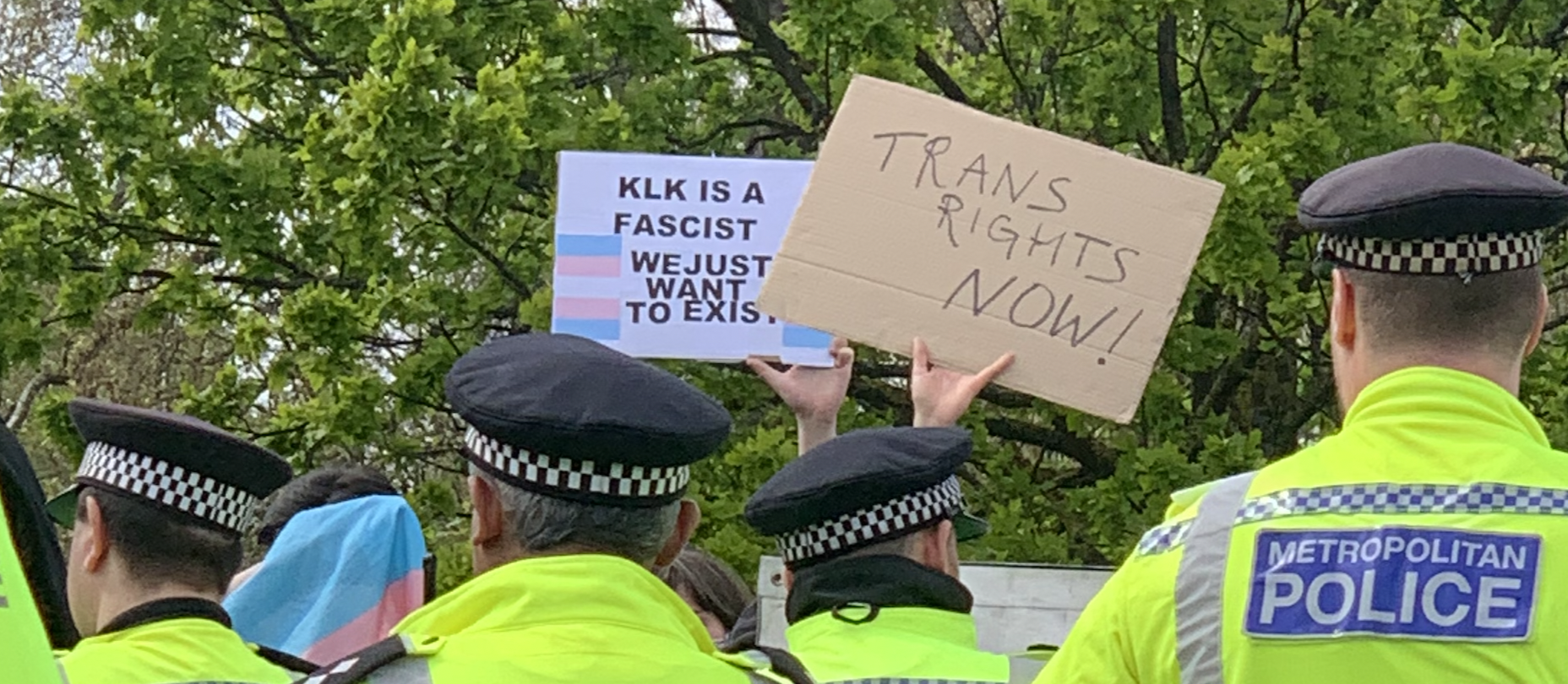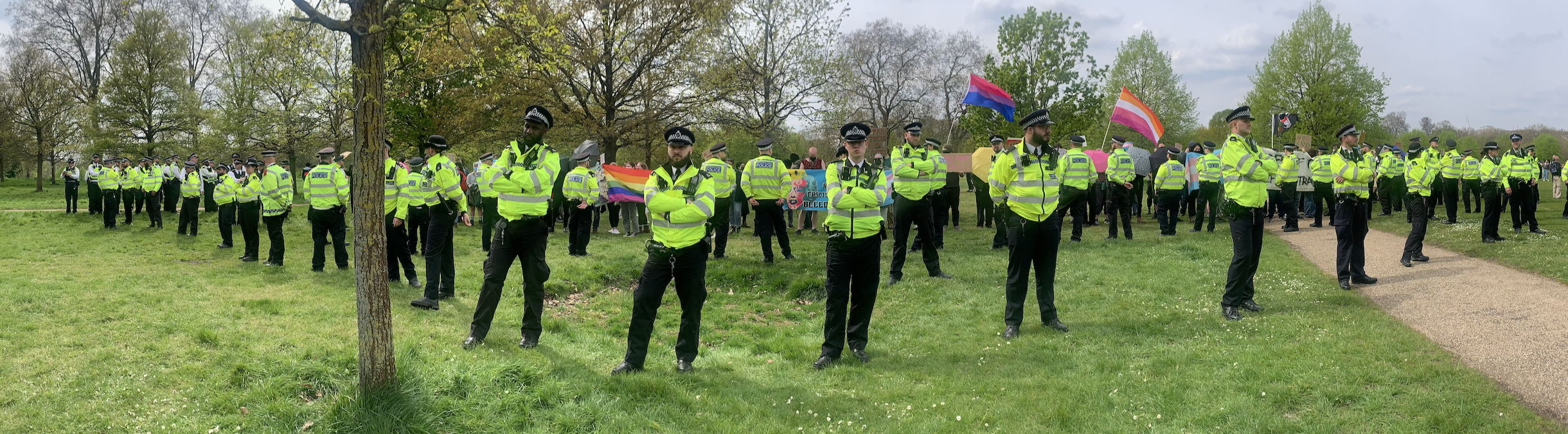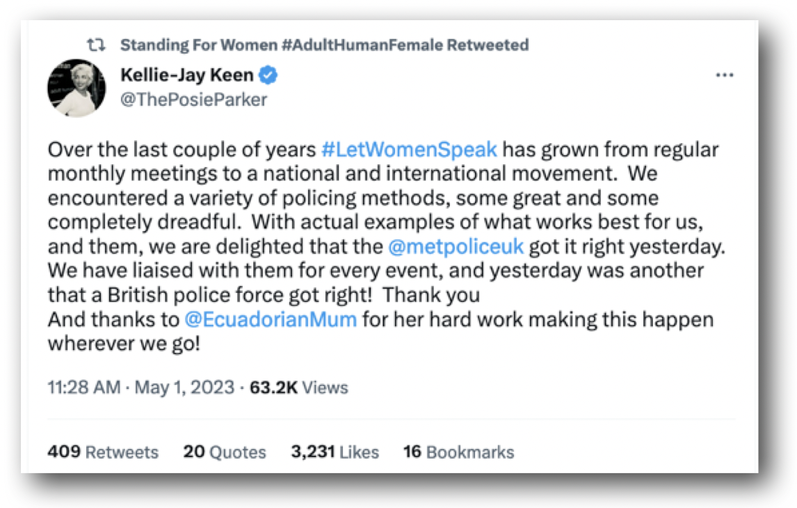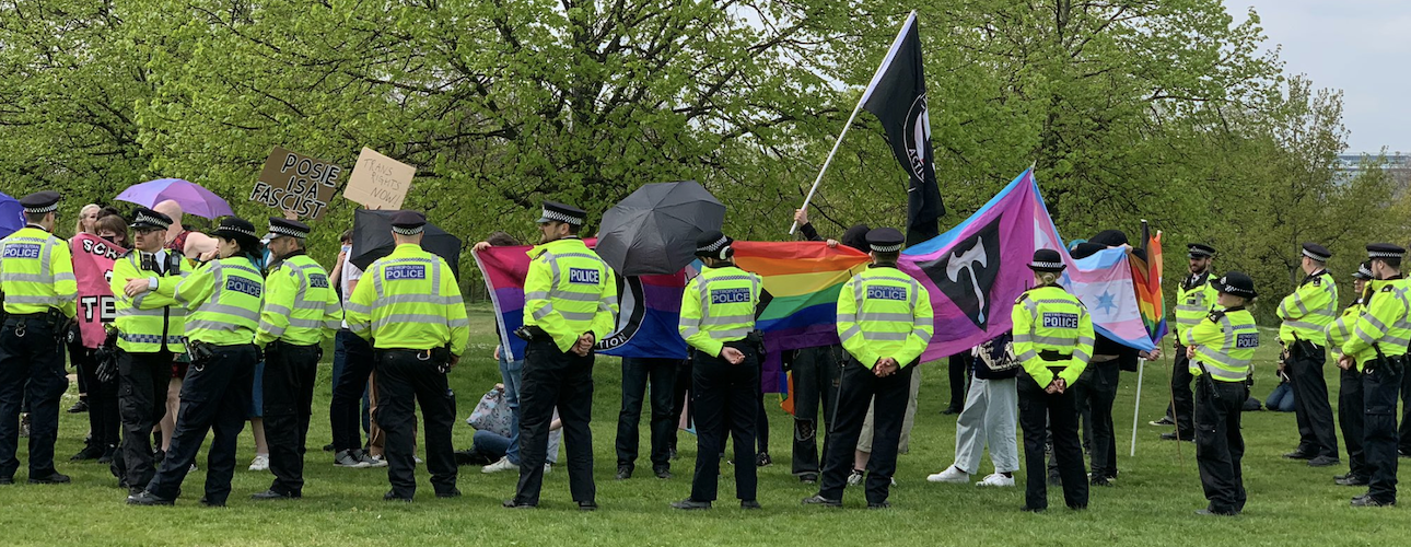 The promised rain hadn’t materialised and it was a warm afternoon. I finished off my cup of coffee and chatted to friends, keeping one eye on the still-chanting group of TRAs. The police were keeping them well away from the main gathering but it would still be easy – as happened an hour later- for a small group to break through. Everywhere I looked were groups of police officers, most on foot, some on horseback, all looking fairly serious and wearing spectacularly clean HiViz. There were many more of them than of the TRAs. I heard a cheer go up on my left and saw that Kellie-Jay had arrived.