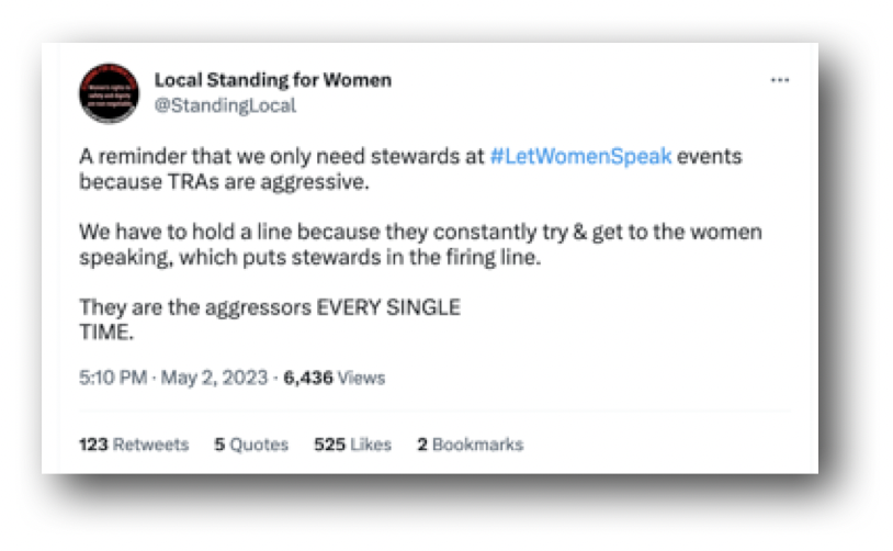 “They are here,” she gestured towards the TRAs, “because we want to say- without fear of punsihment- that no woman has a penis, no man has a vagina, there is no such thing as non-binary and transitioning children is profound abuse.”