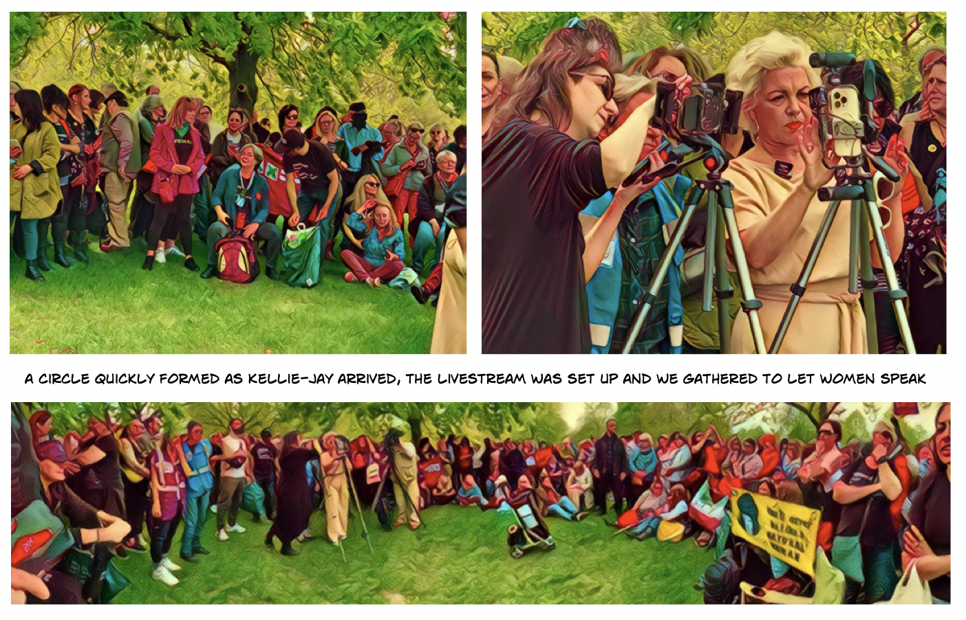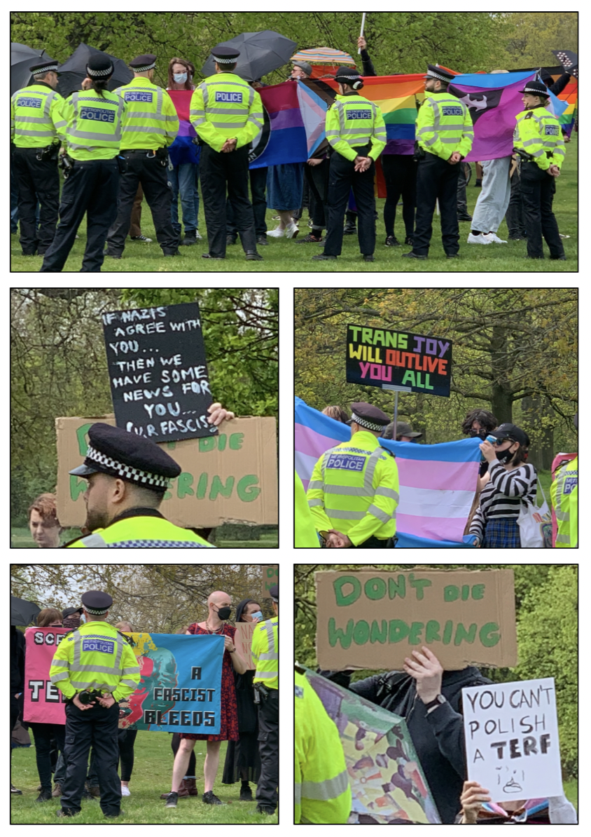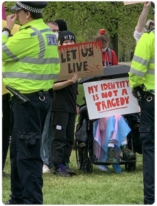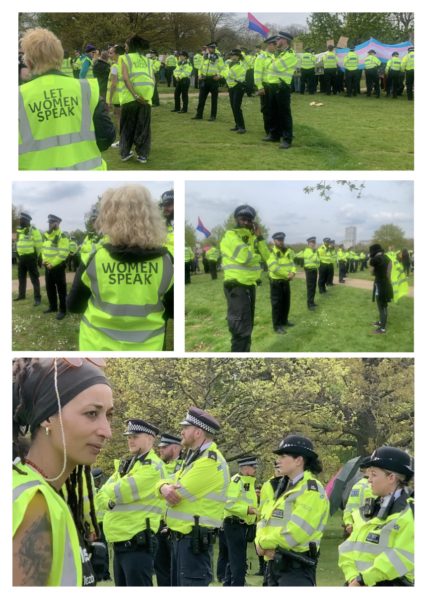 The promised rain hadn’t materialised and it was a warm afternoon. I finished off my cup of coffee and chatted to friends, keeping one eye on the still-chanting group of TRAs. The police were keeping them well away from the main gathering but it would still be easy – as happened an hour later- for a small group to break through. Everywhere I looked were groups of police officers, most on foot, some on horseback, all looking fairly serious and wearing spectacularly clean HiViz. There were many more of them than of the TRAs. I heard a cheer go up on my left and saw that Kellie-Jay had arrived.
