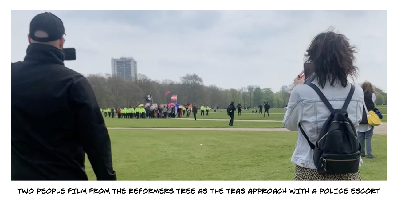 As my bus drove alongside Hyde Park, I saw a gaggle of TRAs collected by the fountain. Ten minutes later, by the time I’d got off the bus, crossed the road and grabbed a coffee, they were just starting to make their way towards those already gathering at the Reformers Tree. I moved quickly, wanting to reach the group before the TRAs got too close.