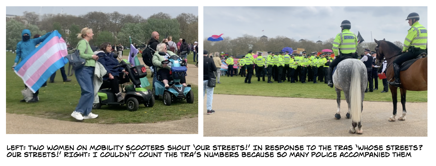 As they marched, they beat a drum and chanted ‘scum, scum, scum’. It was surreal and slightly sickening. “Posie Parker’s a fascist,” they sang to the tune of Seven Nation Army. “Whose streets? Our streets! Whose streets? Our streets!” Two women sitting on mobility scooters shouted back at them “Our streets!”