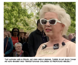 “They are here,” she gestured towards the TRAs, “because we want to say- without fear of punsihment- that no woman has a penis, no man has a vagina, there is no such thing as non-binary and transitioning children is profound abuse.”