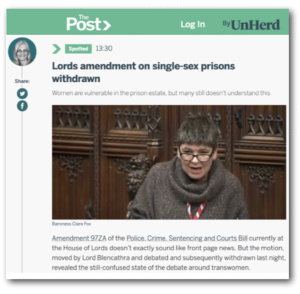 Blencathra doesn’t see it as a defeat because the amendments were part of the ‘important progression of activity’ that has led to the revised Ministry of Justice policy ‘which provides far greater protection for women in prison’.