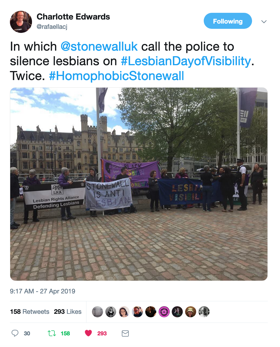 Not only was Stonewall not putting much energy into celebrating LVD, but April 26th 2019 was the morning of its Workplace Equality Conference (or Coinference as some referred to it, tickets costing up to an eye-watering £514) and a group of lesbians and allies had gathered outside the QE2 centre in protest at what they view as Stonewall’s betrayal.