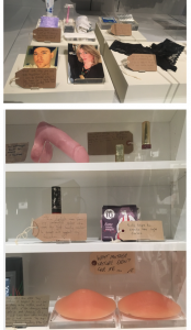 On the far right are hospital garments: juxtaposed with the fake breasts, the outsized penis and the silky underwear, the display overall has the vibe of some kind of creepy medicalised S&M kink show.