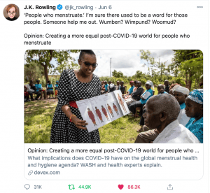 “‘People who menstruate.’ I’m sure there used to be a word for those people. Someone help me out. Wumben? Wimpund? Woomud?” she tweeted.