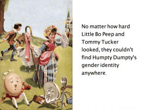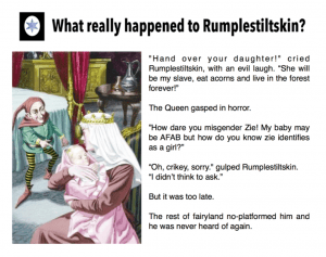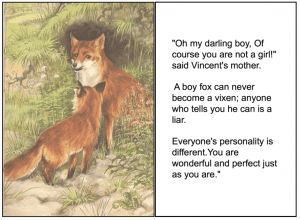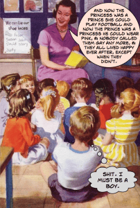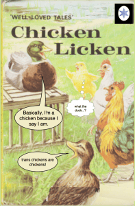 At the time there were lots of books popping up, telling kids to think about if they were trans or not. Most of them are badly written & poorly illustrated. The grammar in some – including the GIRES penguins- is pretty painful. The 4thwave post was a parody of those who jump on the trans bandwagon: for there are plenty of people making money out of the ‘kiddie trans’ industry.