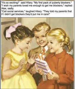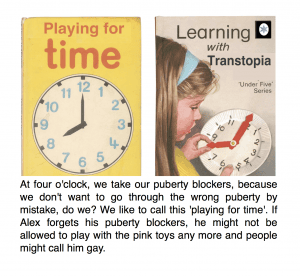 I came up with the above page after speaking to a woman at a conference recently who worked with children at risk, and she said that parents who repeatedly ‘misgendered’ their trans-identified child should be referred to social services.