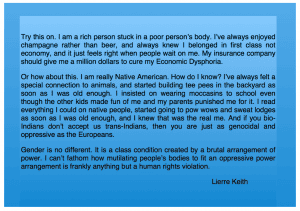 From a culture where telling a girl ‘yes, you’re a boy’ is applauded and telling her ‘No, you’re a girl’ is called conversion therapy.