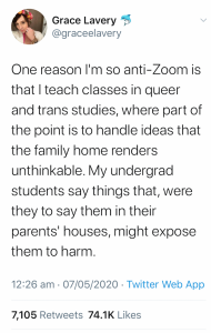 “One reason I’m so anti-zoom,” Grace Lavery, Associate Professor of English at the University of California, Berkeley, confided to 21.8k followers on Twitter a few days ago,“is that I teach classes in queer and trans studies, where part of the point is to handle ideas that the family home renders unthinkable. My undergrad students say things that, were they to say them in their parents’ houses, might expose them to harm.”