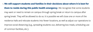 ‘Thanks for your email, which was referred to me. I am assuming you are asking whether during the spring semester students in the campus residence halls were given the option to stay in the dorms or leave amid the COVID-19 pandemic and the move to remote instruction. We gave students the options to leave or stay, and those who left were provided a pro-rated refund of residence hall/dining hall fees.’