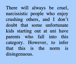 ust as any generation does. I’m not suggesting that everyone who grew up in those times is compassionate and open minded, just making the point that not all parents are bigoted morons whose brains will explode if they’re exposed to a bit of queer theory. There will always be cruel, narcissistic people who enjoy crushing others, and I don’t doubt that some unfortunate kids starting out at uni have parents who fall into this category. However, to infer that this is the norm is disingenuous.