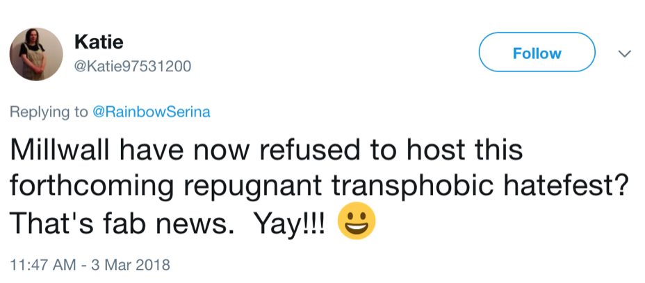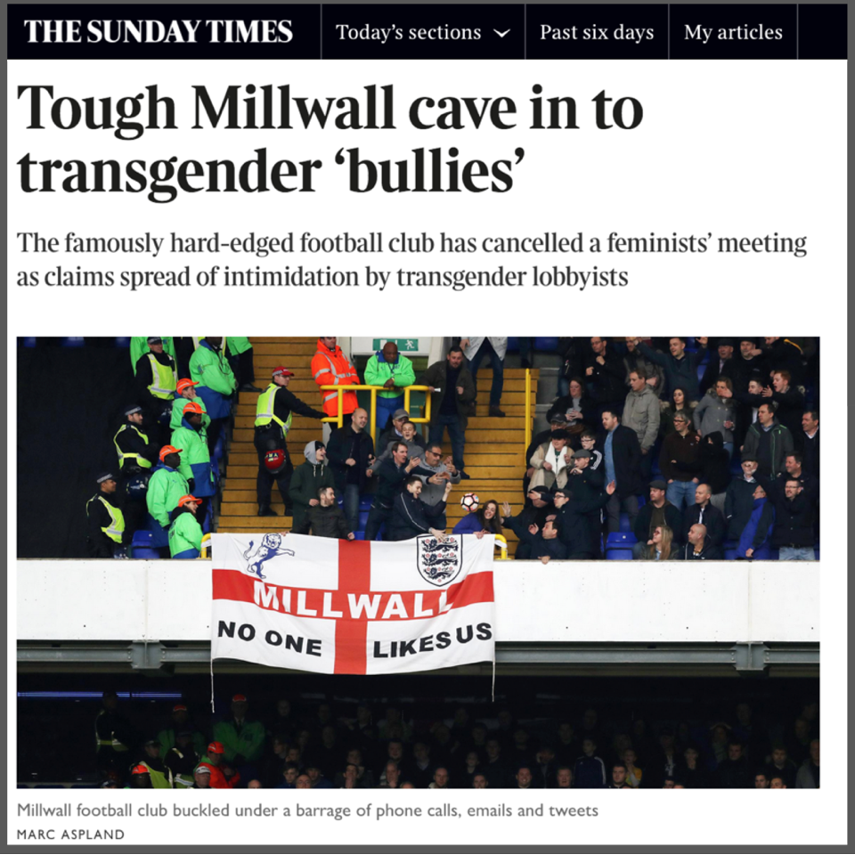 When Venice Allan decided she wanted to book ‘The Den’ at Millwall football club for the ‘Transgenderism and the War on Women’ event, Julia Long had reservations. Long didn’t know much about football but she knew the club’s reputation in the 70s and 80s; the preferred chant of their fans, ‘no-one likes us; we don’t care’ and she didn’t think it was a good idea to be associated with that history of violence and hooliganism.