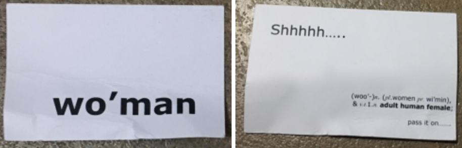 Of course, there was a dash for the loos, where someone had left little white business cards reading “Woman – Shhhhh… adult human female” neatly by the sinks.