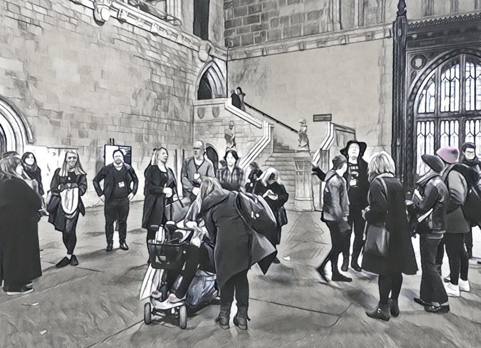 So that’s how my daughter Jessie and I found ourselves at the House of Commons on the evening of Wednesday, March 14th, 2018. For those of you who have never visited the Houses of Parliament, the imposing grandeur of the outside is only dwarfed by the spectacular interior. Stunning artworks are painted directly onto the walls. (You can see one of my favourites here) Stained glass windows loom over stone staircases and the hallways are lined with white marble statues of scowling, corpulent men garbed in frills and wigs, strangely reminiscent of some of my evenings on Twitter. Photography is only allowed in St Stephens’ and Westminster Halls, where, overlooked by Queen Eleanor of Castile (left), we waited for seven o’clock to arrive.