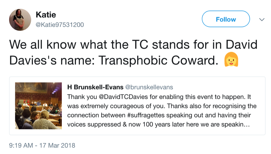 It has been pointed out that David Davies has a history of voting against things that might benefit LGB people: notably calling the idea of gay marriage ‘barking mad’ back in 2012. The point here is not that he needs to agree with everything lesbian feminists have to say: the point here is that he supports their right to have a meeting to discuss their views- and for that I add my thanks to that of the other women present that we were allowed to hear them speak.