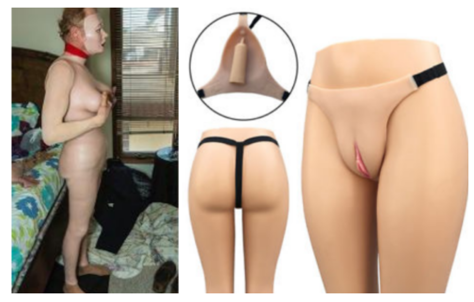Jeffreys’ slides of the range of online fetishistic items brought a series of groans from the audience: the full body suit (above), where the male literally encases himself in the body of the female, eerily highlighting her point about parasitism.