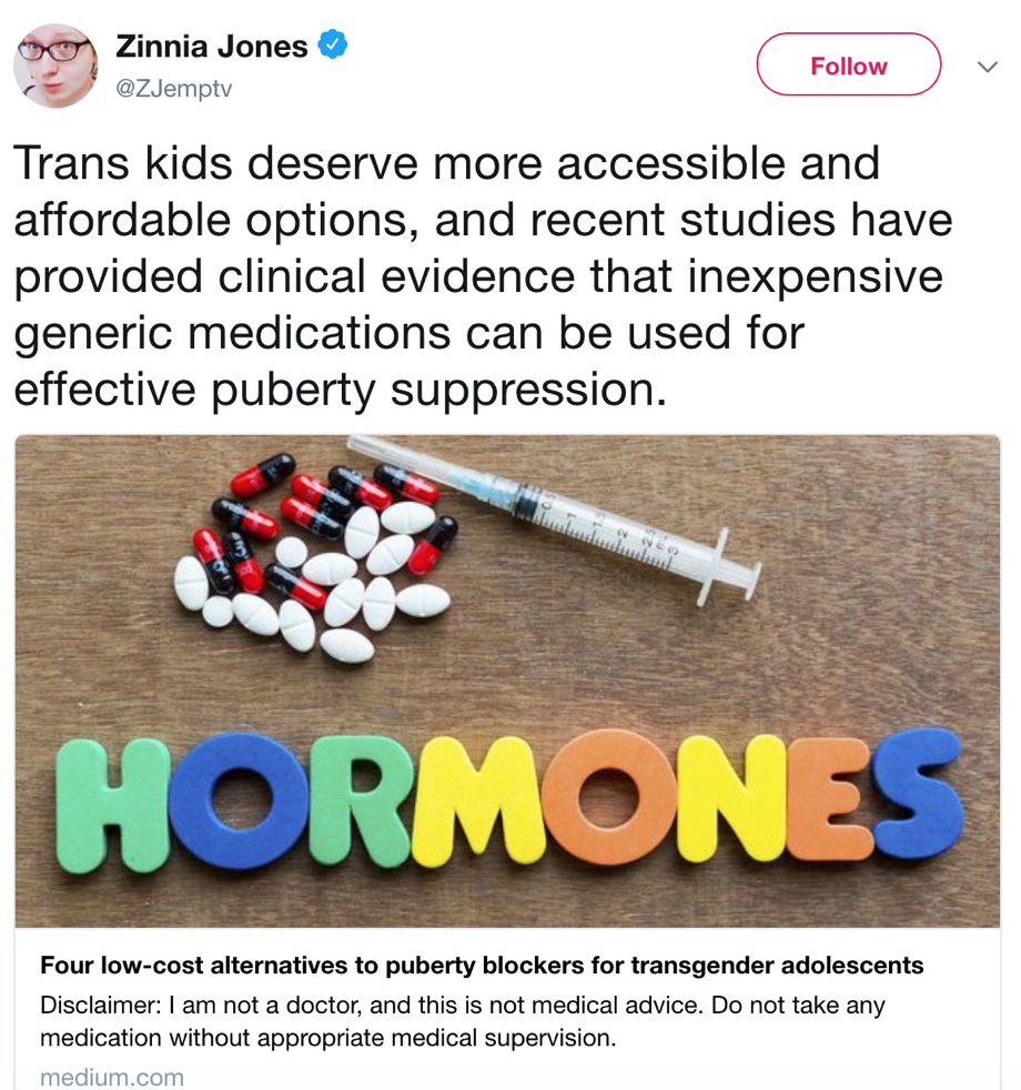 She reminded us that these girls are the subject of experimentation for untested and potentially unsuitable drugs which they can purchase illegally online, and they are vulnerable to the trans-identified adults who befriend them on social media and tell them where to purchase these drugs.