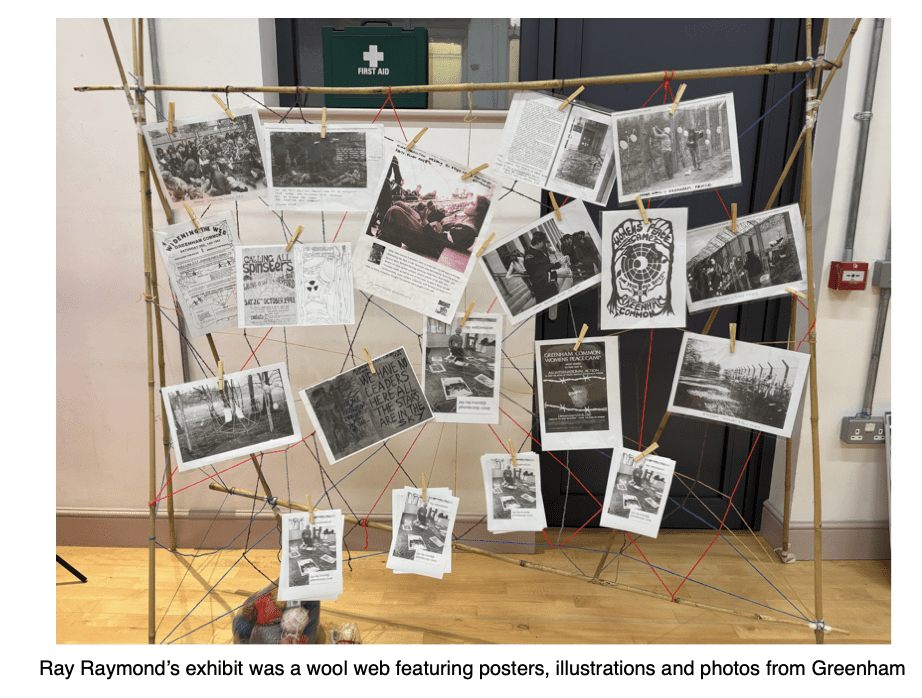 Raymond gives an example of the way they would use these webs. Hundreds of women were being arrested, so the courts started trying women in their home town magistrates courts. Three women took balls of wool into Totness Magistrates Court and ‘webbed up’ the public gallery.