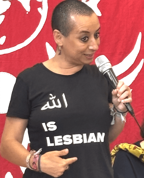 The next speaker, Betty Lachgar, began by telling us that her T-shirt read ‘Allah is a lesbian’. After wearing it at a conference in Germany in 2020, she was arrested on her return to Morocco. The investigation is still in progress.