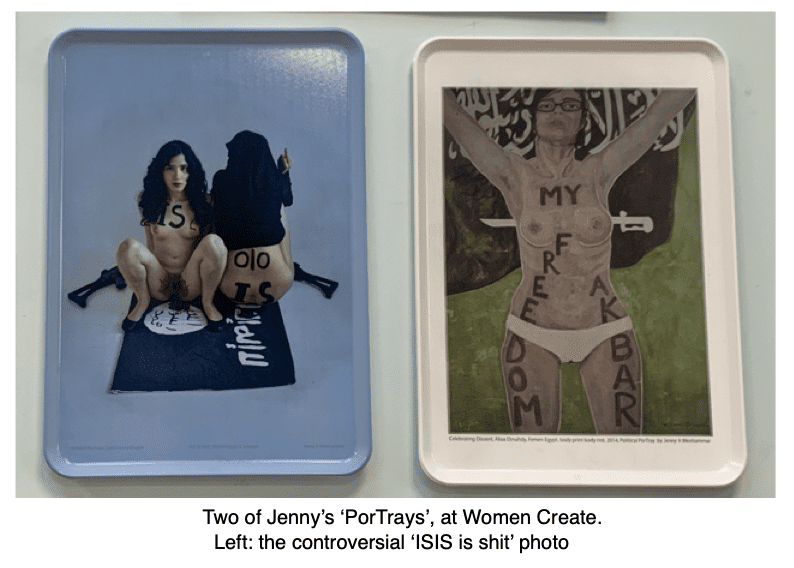 In 2014, she tells us, she made an ISIS flag, and she and another woman were photographed menstruating and defecating on it. She has been in court several times for her feminist actions.