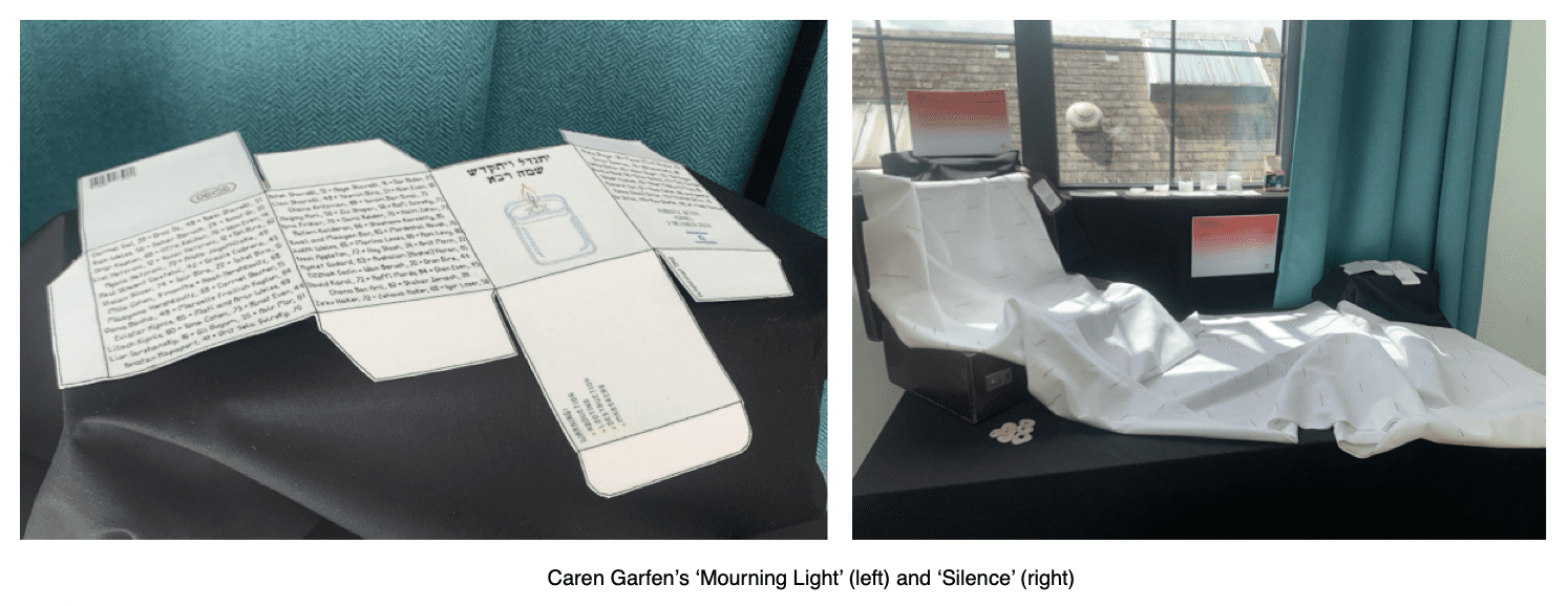 I was moved by Caren Garfen‘s ‘Morning Light’, a recreated remembrance candle box, featuring the hand-stitched names of the 101 people murdered at Kibbutz Be’eri in Israel on October 7th 2023. It was exhibited next to her shroud, stitched with the names of women raped and murdered by Hamas terrorists on the same day.