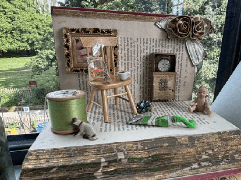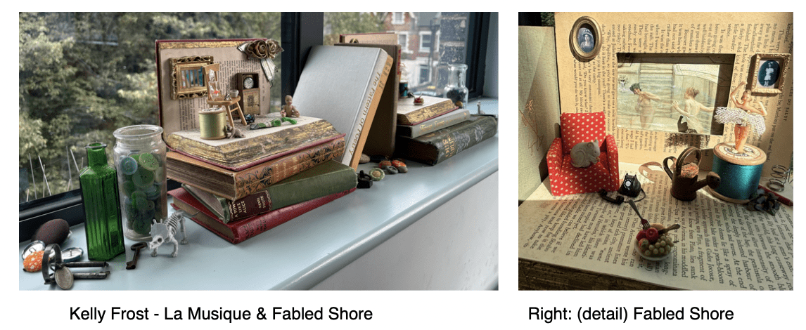 I also exhibited two assemblages: La Musique and Fabled Shore, named after the vintage hardback books that make up part of the base. On top of these are open books which form a sort of stage, a set. A collection of tiny objects are arranged on the stage and arranged in a way that plays with scale. A tiny Eiffel Tower sits on top of a wooden dolls’ house chair, next to goldfish in a bag.