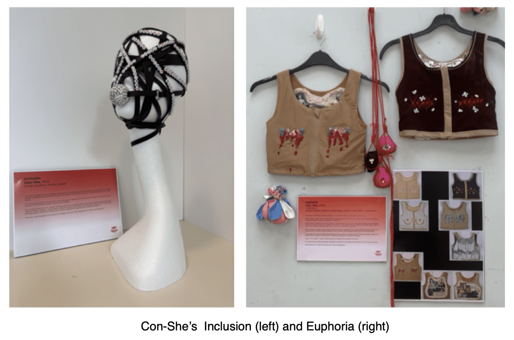 “When Claudia asked me to exhibit, I immediately felt that horrid imposter syndrome. Why me? I’m not a proper artist! Surely my work doesn’t belong next to Claudia’s exquisite pots and Con-She’s beautiful and sobering breast binders! But these feelings melted away on installation day. For me personally it was great to feel a sense of pride and surge of confidence in my work when I saw it hanging in the space. “I do belong here,” I thought.