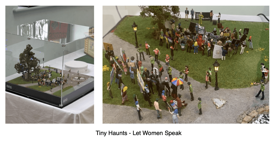 Graham writes that she wanted “to honour the courage, solidarity and defiance of women who stand tall and speak the truth despite immense intimidation from misogynist men and their handmaidens… small figures, big voices.. tiny worlds.. powerful truths and art that holds the line.”