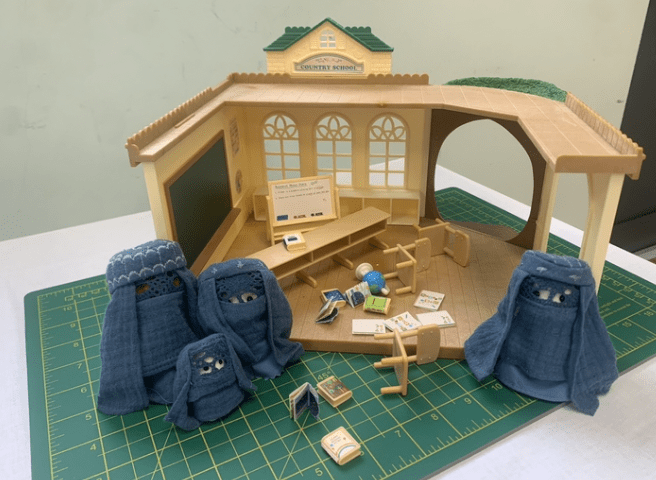 ‘Tale from Taliban High’ features Sylvanian family dolls dressed in blue cotton burquas, a piece created by a woman calling herself BigMumma.