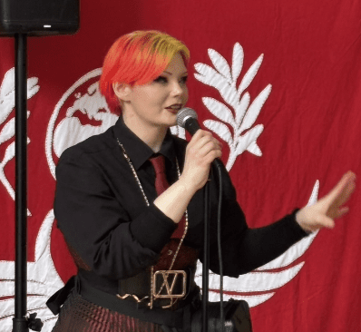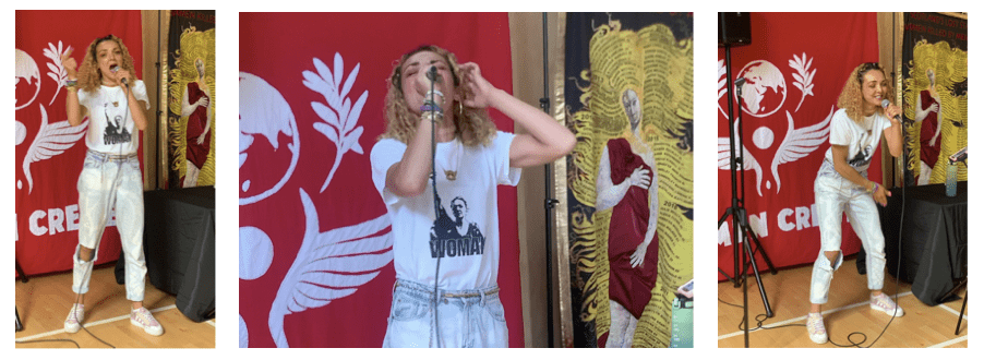 The next speaker was an anonymous artist from Glasgow, who creates as a performance artist character called Con-She. A play on words, Con-She can mean both ‘with her’ and ‘conscientious objector’. She said she had recently been reflecting on the new movement that women are creating going forward.