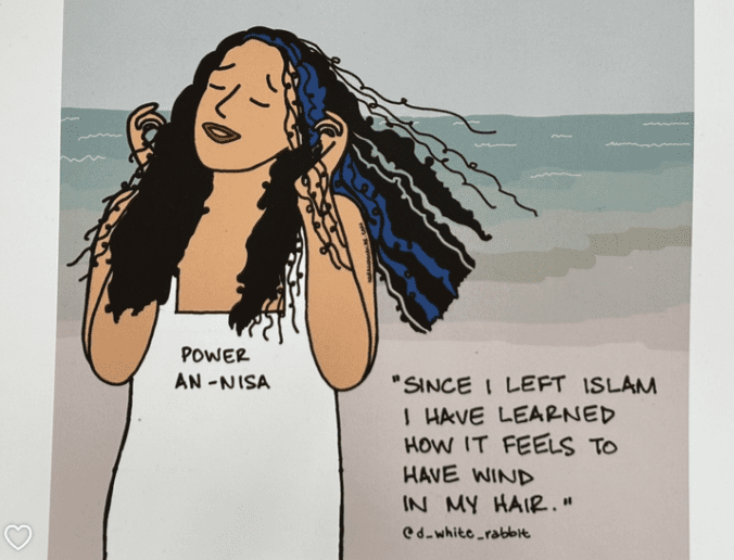 Her style is deliberately child-like, as she says,‘a lot can be said with a simple drawing’. Her 10,000 Instagram followers are not only ex-Muslims, but ex-Christians, ex-Mormons and ex-Jews. Many have reached out and shared that they were afraid of leaving their religion and that her doodles “provided some space for belonging and affirmation”.