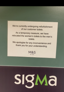 “We are currently undergoing refurbishment of our customer toilets. As a temporary measure we have relocated the women’s toilets to the men’s toilets. We apologise for any inconvenience and thank you for your understanding.