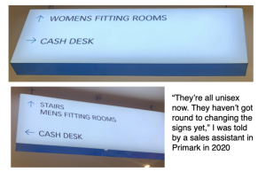 In 2019 it brought in ‘gender neutral’ changing rooms to some of its new stores, causing The Sun newspaper to call it a ‘gender offender‘ (groan) and in 2020 I was told by a young woman in a large London Primark store that despite the ‘Women’s’ and ‘Men’s’ signs over the changing rooms, they were “all unisex now”.