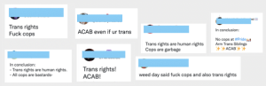 Who can blame the TRAs for that? They’re trying to look all hard and cool in their ‘black pampers’ outfits and along come the cops waving rainbows in their faces. It’s probably pretty much how the Arctic Monkeys felt when Gordon Brown said they were his favourite band.