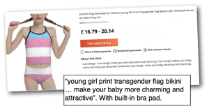 Let’s not lose sight of the fact that ‘trans’ is not a diagnosis, ‘gender dysphoria’ is a diagnosis. ‘Pink for girls and blue for boys’ is a symbol of all the stereotypes we had been working hard to break down before trans ideology came along and glued the wall back together again. And let’s remember that there are people out there who will sexualise children (above) and happily make them part of their fetish or agenda, whether it’s through hand crafting ‘packers’ so little girls can be ‘stealth’, or dressing little boys up like LOL dolls.