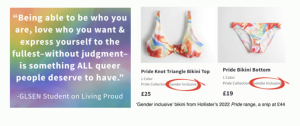 I didn’t enter Hollister, but I did have a look at their website when I got home. Items in their 2022 Pride range available include a ‘gender inclusive’ bikini, a snip at a mere £44.
