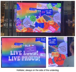 We enter a second circle of shops and are faced with a dramatic ‘Pride’ display in the window of Hollister, that well known friend of the underdog. Yes, this is the same Hollister that for many years employed its sales staff as ‘models’, allowing the company to hire based on looks and body type. So inclusive. Their Regents Street branch is so dimly lit that my friend who shops there turns on the torch on his phone so he can see the colours of the clothing properly. Dark the inside of its stores may be, but it seems Hollister has seen the metaphorical light, and is now especially concerned with Trans Rights and Black Trans Lives.