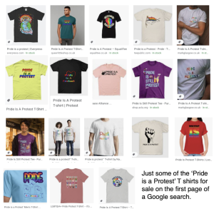 Google ‘Pride is a protest’ T shirt’ and you get thirteen million hits back in just a few seconds. The more realistic slogan ‘Pride is a corporate cash cow’ doesn’t seem to have caught on.