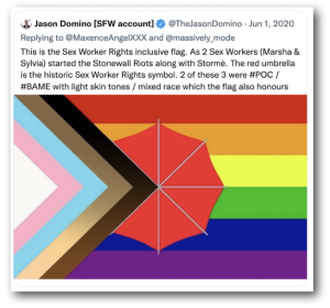 One version of the flag contains a red umbrella to symbolise ‘sex worker’ inclusion, and variated skin-tone stripes, but that doesn’t seem to have caught on. What next?